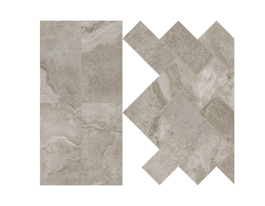 Floor/Wall Tile: 12×24 Glazed Porcelain & 2×4 Herringbone Mosaic Glazed Ceramic —Matte Finish
