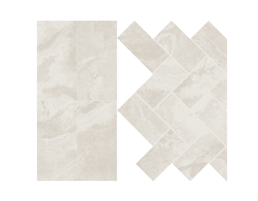 Floor/Wall Tile: 12×24 Glazed Porcelain & 2×4 Herringbone Mosaic Glazed Ceramic —Matte Finish