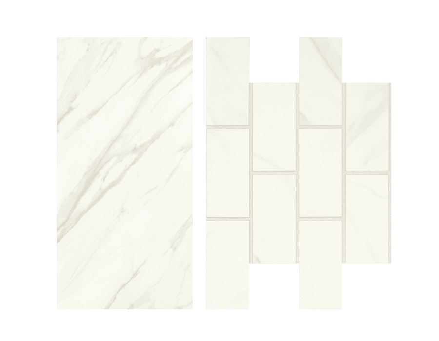 Floor/Wall Tile: 12×24 Glazed Porcelain & 2×4 Brick-joint Mosaic Glazed Ceramic—Matte Finish
