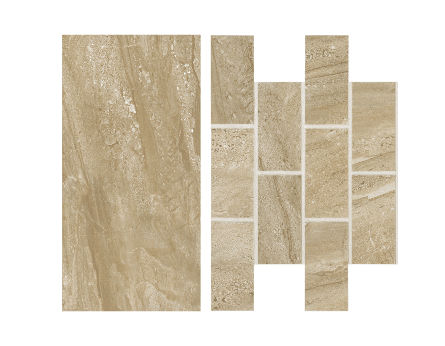 Floor/Wall Tile: 12×24 Glazed Porcelain & 2×4 Brick-joint Mosaic Glazed Ceramic—Matte Finish