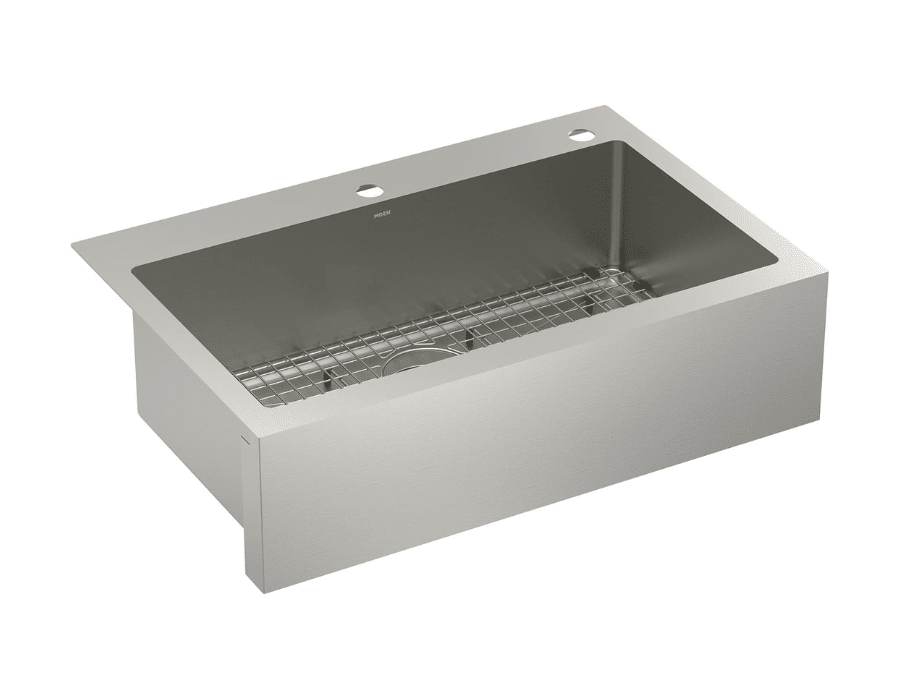 Apron/Farm sink for use in laminate countertops Moen GS1812092B 33″ x 22″ x 9″ Apron Front, top-mount single-bowl, requires DSB cabinet, minimum 36″ 2 holes, 9″ depth