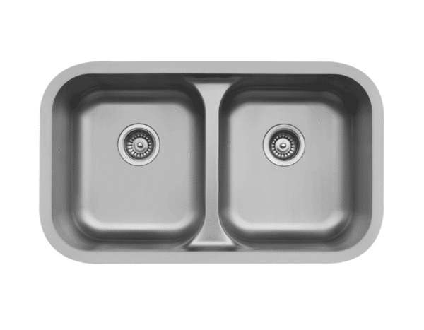 Undermount sink for laminate top only Karran E-350 18 Gauge Stainles Steel, Double Bowl, Seamless Undermount Sink Outside dimensions: 32-3/8″ x 19″ Inside dimensions: Left bowl: 14-1/8″ x 16-1/2″ x 8-1/2″ Right bowl: 14-1/8″ x 16-1/2″ x 8-1/2″ Bowl divider height: 6-1/4″