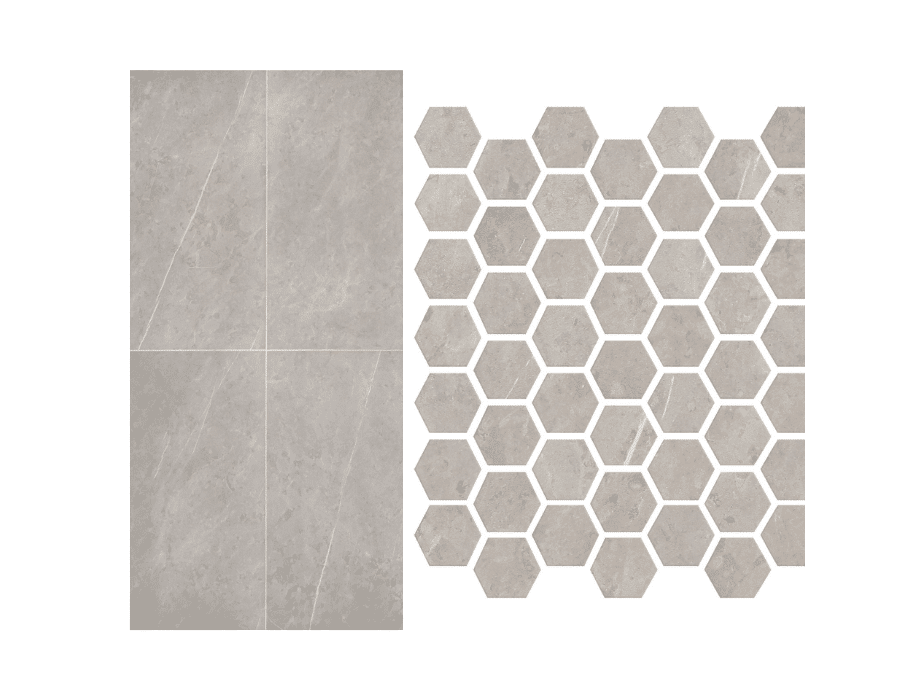 Floor/Wall Tile: 12×24 & 1.5” Hex Mosaic Glazed Ceramic—Matte Finish